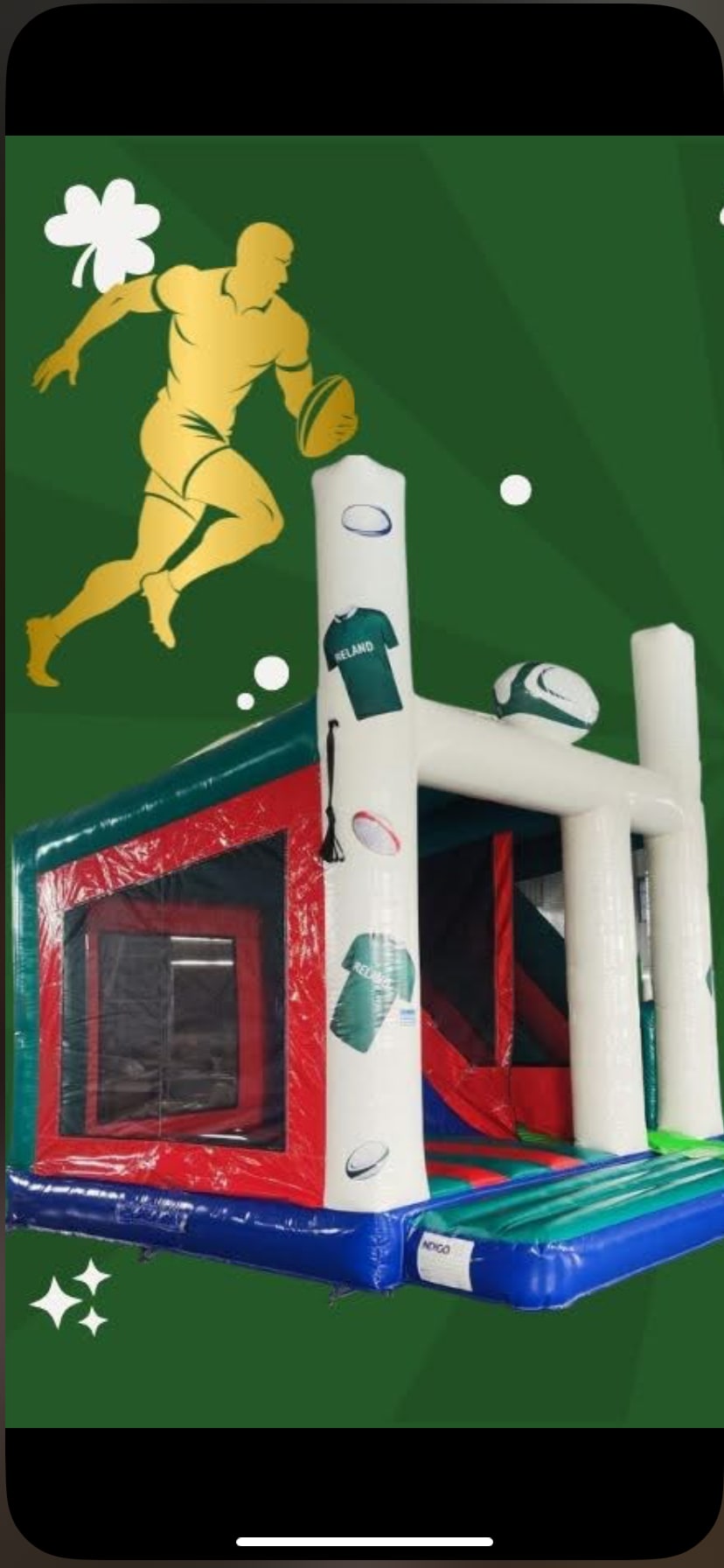 Unleash your passion for rugby with our 18FT x 15FT Six Nations Ireland Rugby Bouncy Castle Perfect for creating an exhilarating rugby experience, this massive inflatable is expertly designed for fans, athletes, and anyone looking to enjoy the spirit of Ireland's favourite sport. This, Bouncy Castle is guaranteed to bring excitement and fun to every occasion. 🏉☘️ CMON IRELAND!!!